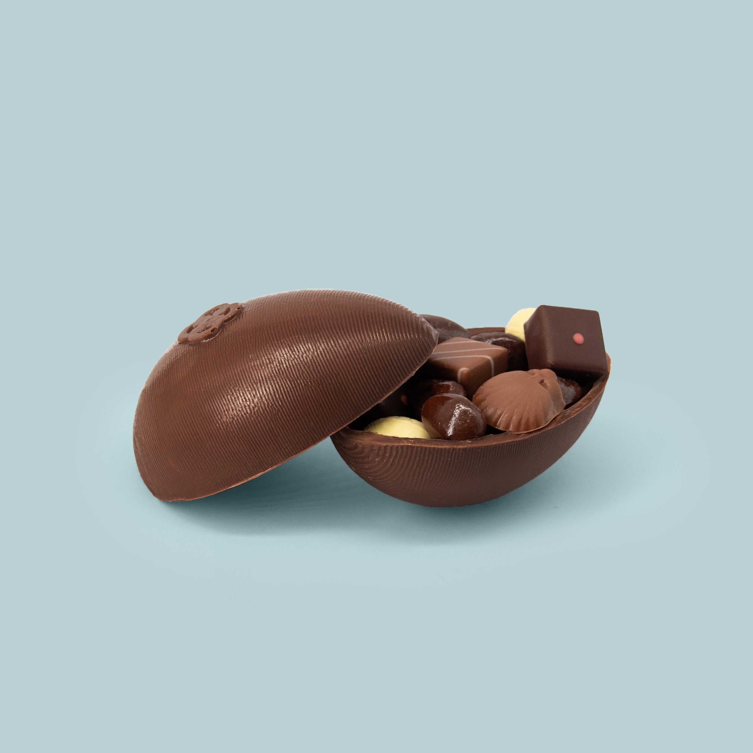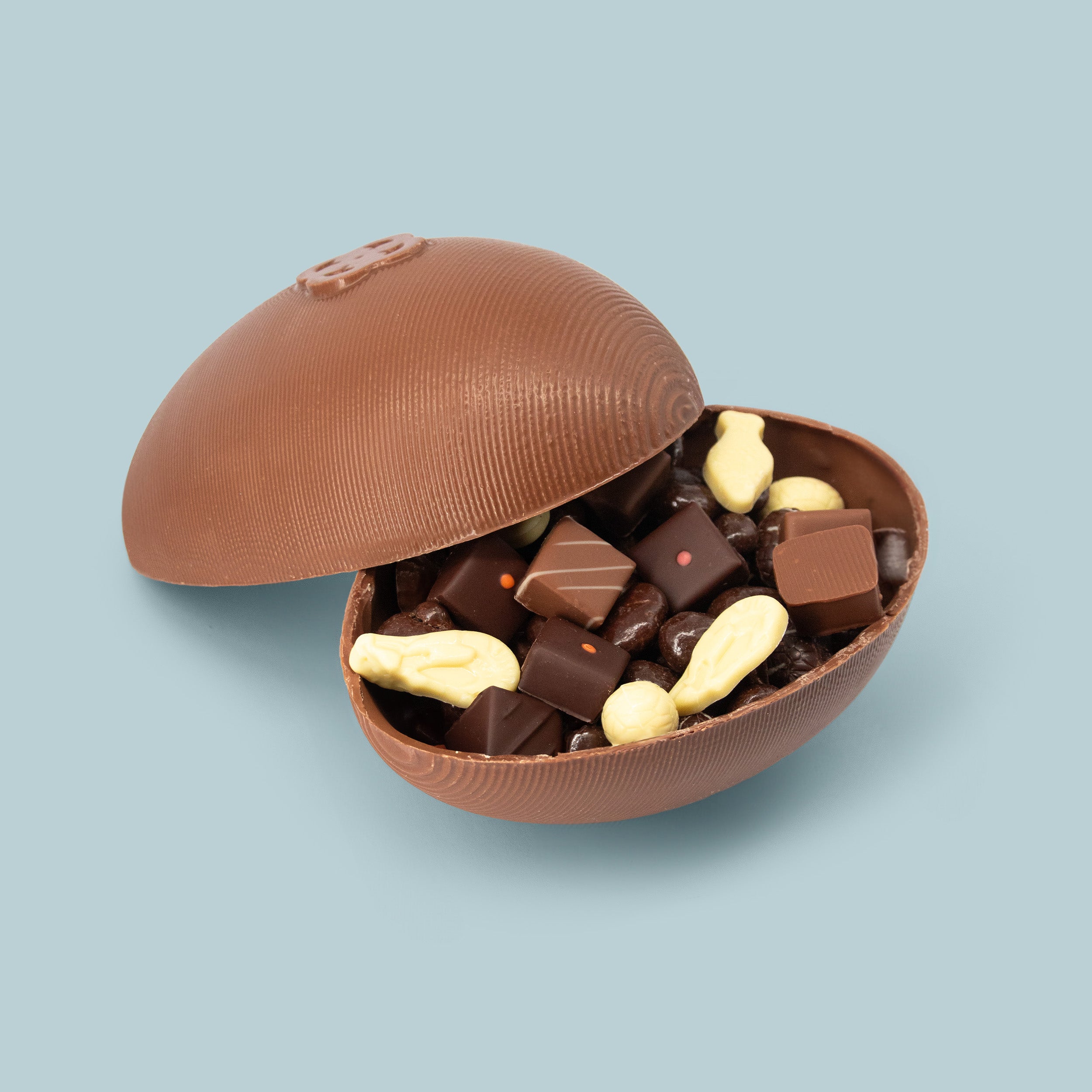 Erhältlich in drei Größen: M (270 g), L (400 g), XL (610 g), enthalten unsere charakteristischen Eier eine großzügige Auswahl an sorgfältig ausgewählten Leckereien: Osterkrapfen, Schokoladenbonbons und kleine Eier aus dunkler und Vollmilchschokolade, gefüllt mit Pralinen, Karamell und Ganache.