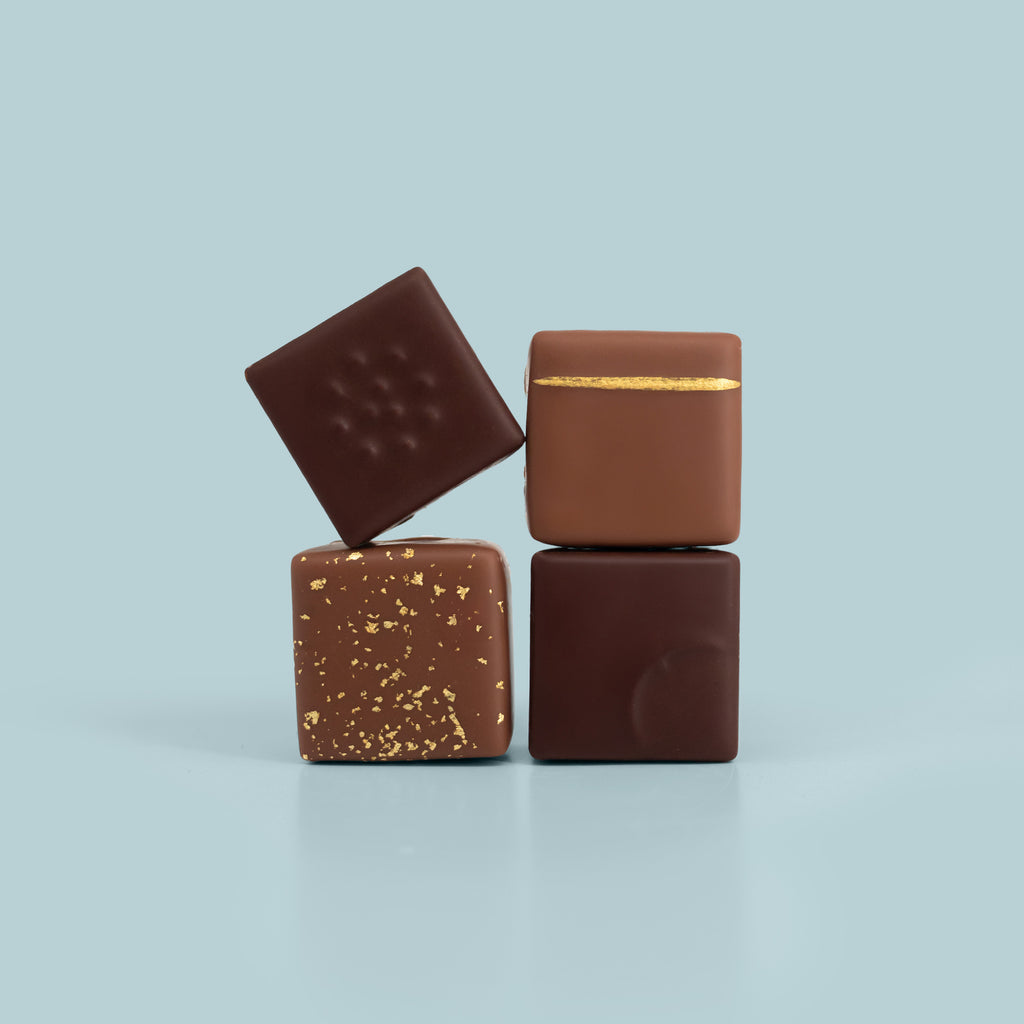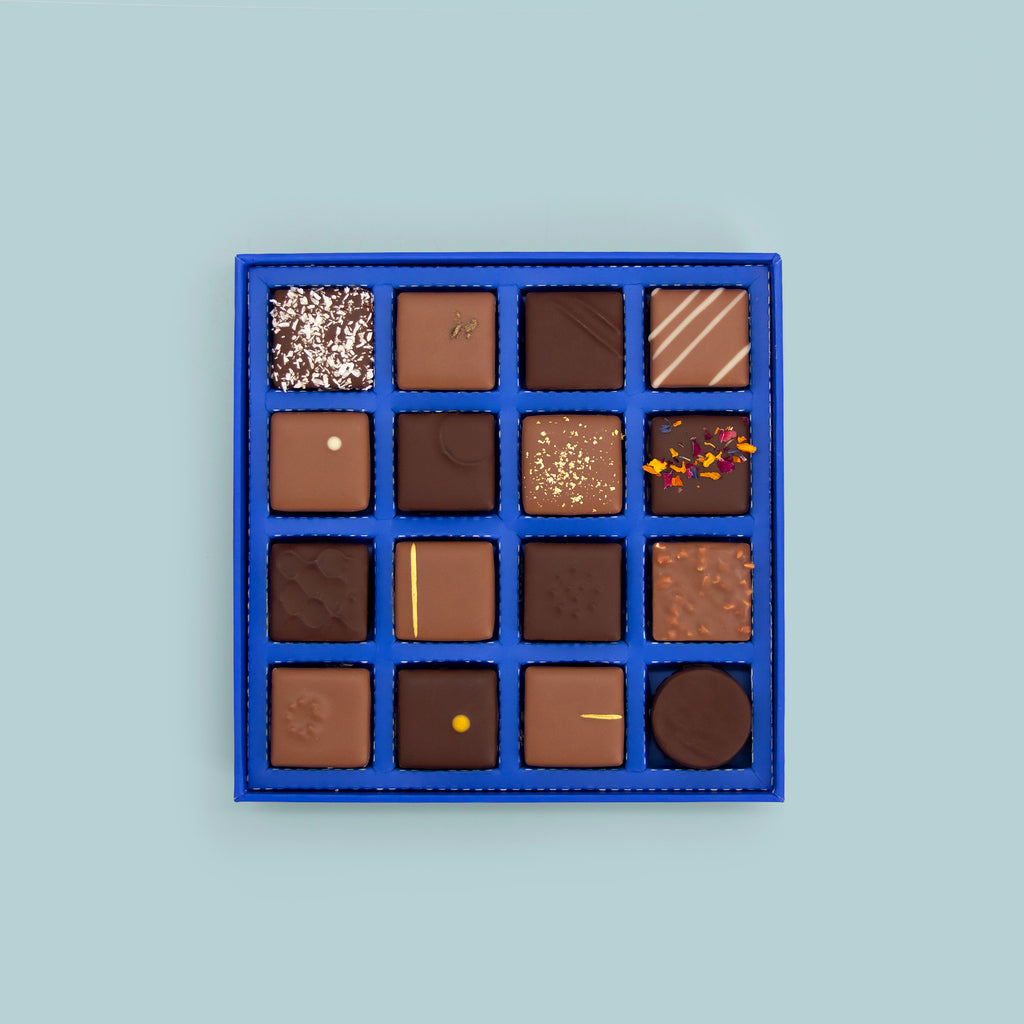 Dans cet égalant coffret bleu nuit, découvrez un délicieux assortiment de 16 bonbons, parmi lesquels les grands classiques de la Maison et des quatre parfums de saison :