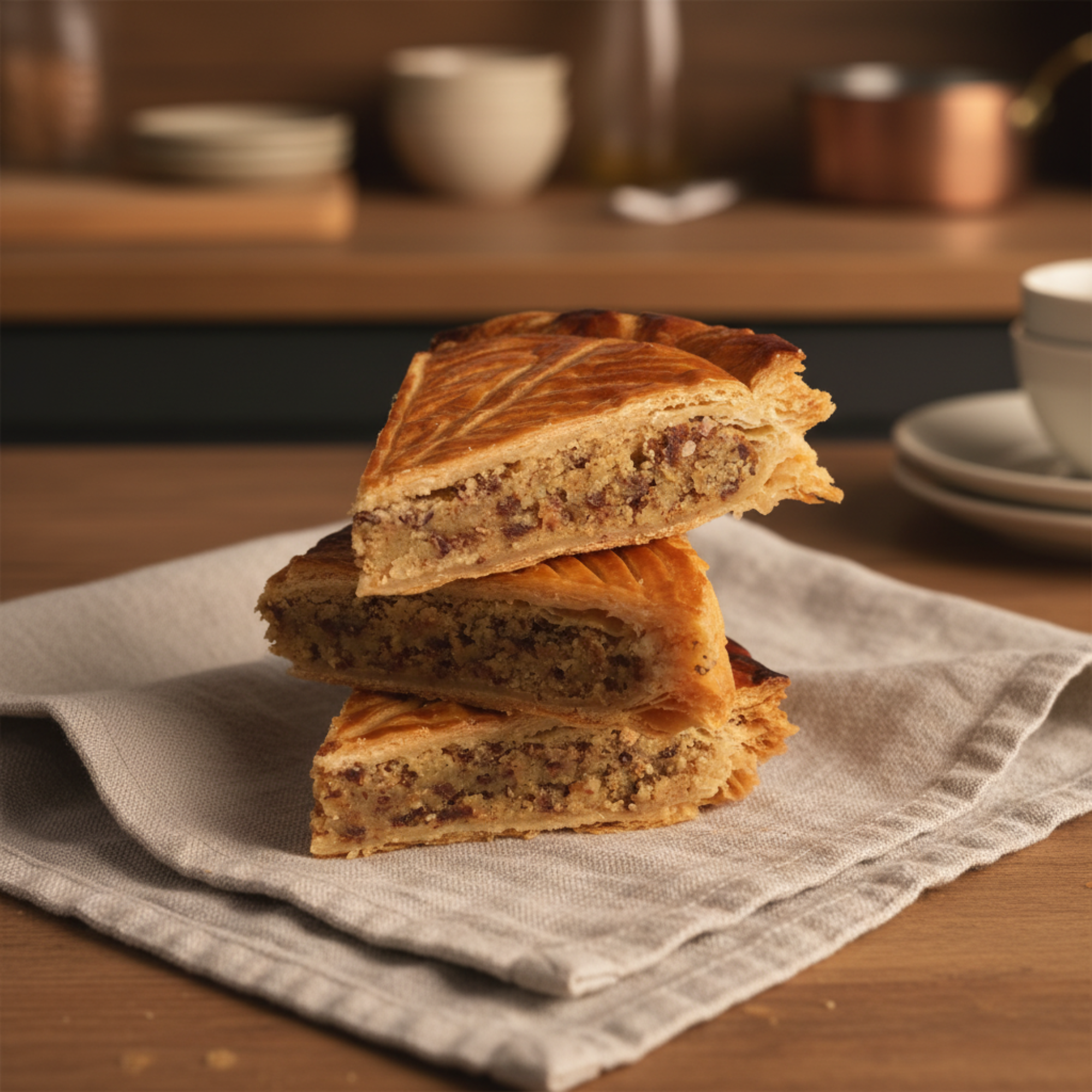 En son cœur, une frangipane généreuse associe crème d’amandes et crème pâtissière, sublimée par des pépites de chocolat noir 63 % origine Pérou. La crème pâtissière, délicatement parfumée à la vanille de Madagascar, apporte douceur et rondeur, tandis que les amandes brutes au sucre cassonade confèrent une texture authentique et un caractère à la fois rustique et raffiné.