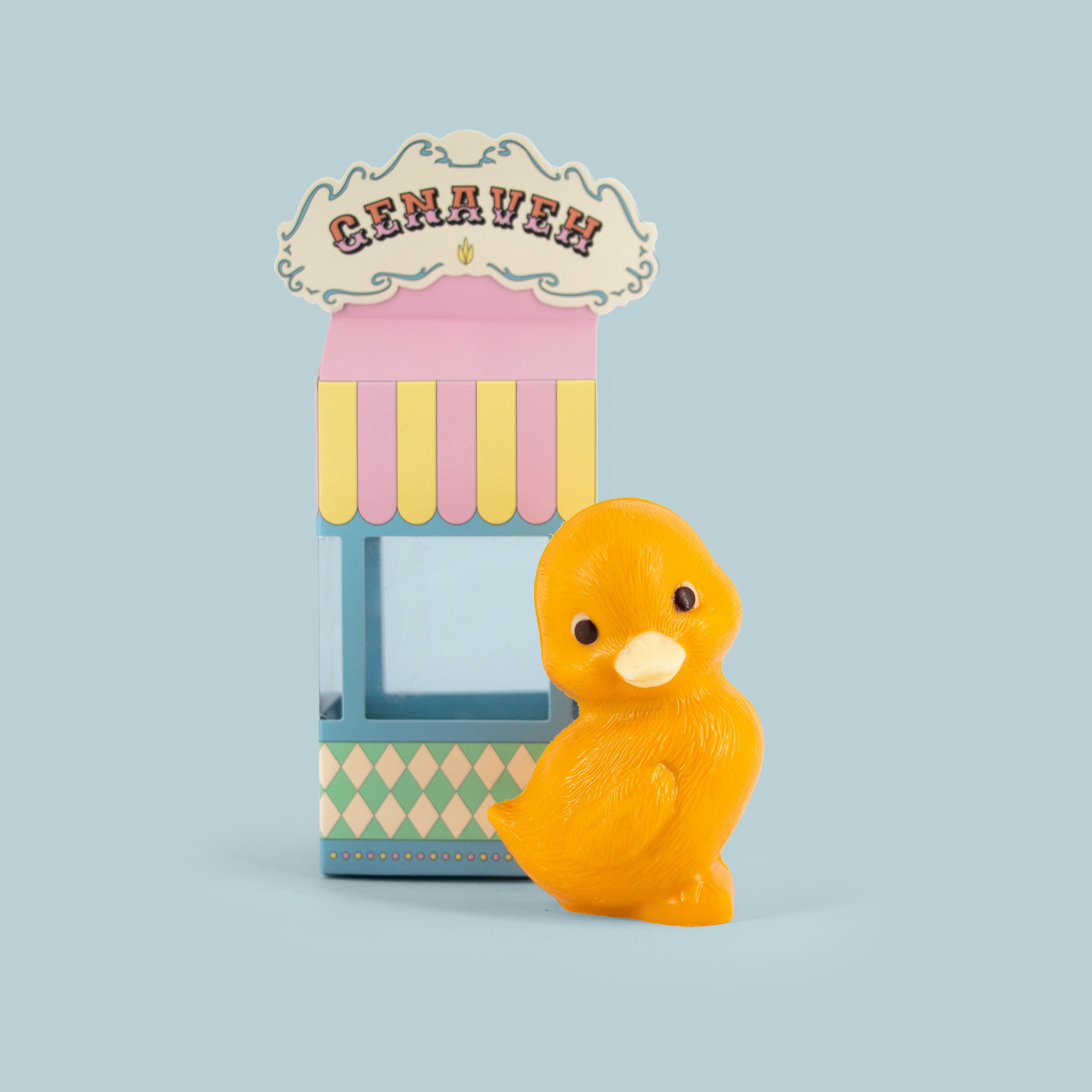 Moulé et décoré à la main, le poussin de Pâques est réalisé en chocolat au lait 39% origine Sao Tomé-et-Principé et chocolat blanc 32%.